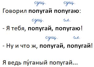 Эти слова (попугай - животное, попугай - повелительное наклонение глагола попугать) - омонимы, пишутся одинаково, но смысл у них разный. При определении части речи учитывай, что в тексте есть обращения к попугаю (имена существительные), выделенные запятыми.