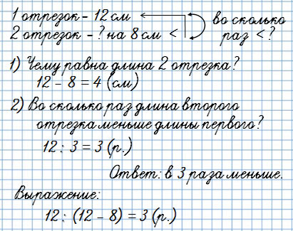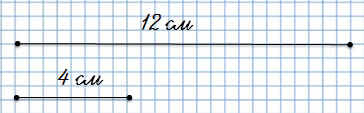 Начерти два отрезка: первый длиной 12 см, а второй на 8 см короче. Во сколько раз длина второго отрезка меньше длины первого?