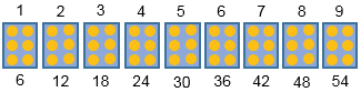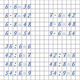 | 3 • 6 = 18 5 • 6 = 30 7 • 6 = 42 9 • 6 = 54 10 • 6 = 60 1 • 6 = 6 | 12 : 6 = 2 24 : 6 = 4 48 : 6 = 8 42 : 6 = 7 60 : 6 = 10 6 : 6 = 1 |