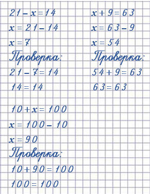 | 21 - х = 14 х = 21 - 14 х = 7 | х + 9 = 63 х = 63 - 9 х = 54 | 10 + х = 100 х = 100 - 10 х = 90 |