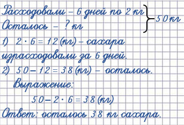 В школьной столовой было 50 кг сахару. Его расходовали 6 дней, по 2 кг каждый день. Сколько килограммов сахару осталось?