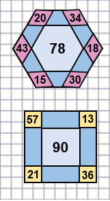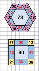В занимательных рамках сумма чисел , расположенных по каждой стороне фигуры, должна быть равна числу в центре фигуры.