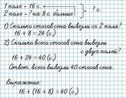 5. С первого поля вывезли 16 стогов сена, а со второго — на 8 стогов больше, чем с первого. Сколько стогов сена вывезли с этих двух полей?