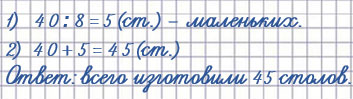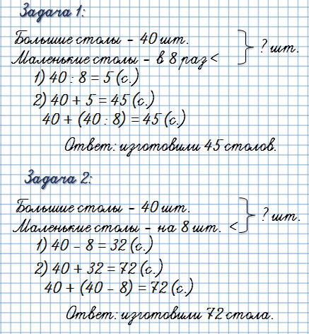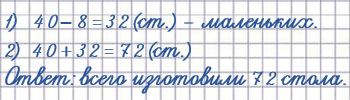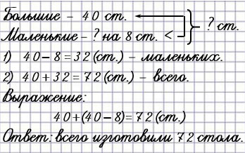 2) В мастерской изготовили 40 больших столов, а маленьких на 8 меньше, чем больших. Сколько всего столов изготовили?