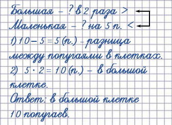 8. В большой клетке попугаев в 2 раза больше, чем в маленькой, а в маленькой на 5 попугаев меньше, чем в большой. Сколько попугаев в большой клетке?