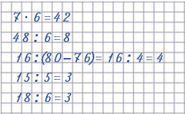 | 7 • 6 = 42 | 48 : 6 = 8 | 16 : (80 - 76) = 4 |