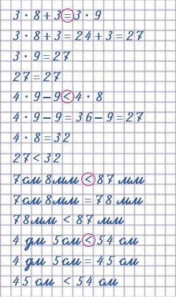 | 3 • 8 + 3 = 3 • 9 | 7 см 8 мм < 87 мм |