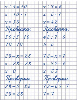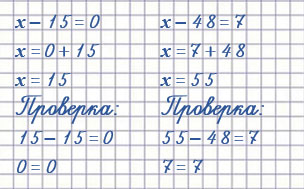 | 23 + х = 31 х = 31 - 23 х = 8 Проверка 23 + 8 = 31 31 = 31 | k - 17 = 33 k = 33 + 17 k = 50 Проверка 50 - 17 = 33 33 = 33 | 45 - a = 9 a = 45 - 9 a = 36 Проверка 45 - 36 = 9 9 = 9 |