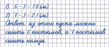 2) 7 • 3 = 21 (м), - потребуется ткани на 6 костюмов, 21 м > 20 м , значит, ткани на 7 костюмов не хватит.