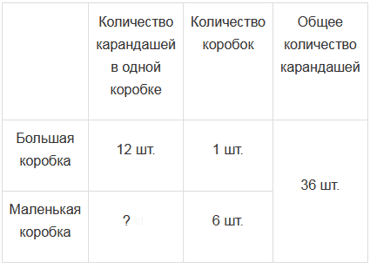 14. Купили 36 цветных карандашей. Из них 12 карандашей были в большой коробке, а остальные - в маленьких коробках, по 6 штук в каждой. Сколько было маленьких коробок с карандашами?