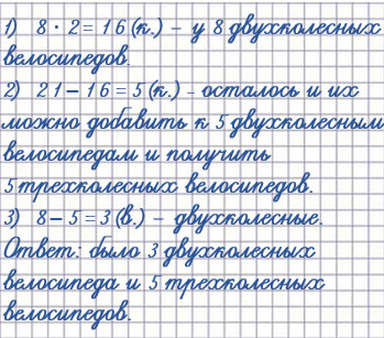 16. В цирке выступали обезьянки на двух- и трёхколёсных велосипедах. Сколько было двух- и трёхколёсных велосипедов, если всего было 8 велосипедов и 21 колесо?