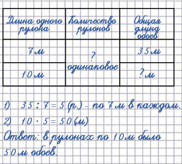3. Купили 35 м обоев в рулонах, по 7 м в каждом, и столько же рулонов, по 10 м в каждом. Сколько метров обоев было в рулонах по 10 м?