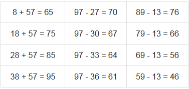 | 8 + 57 | 97 - 27 | 89 - 13 |