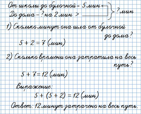 5. От школы до дома Оля шла без остановок. От школы до булочной Оля шла 5 минут, а от булочной до дома на 2 минуты больше. Сколько времени Оля затратила на весь этот путь?