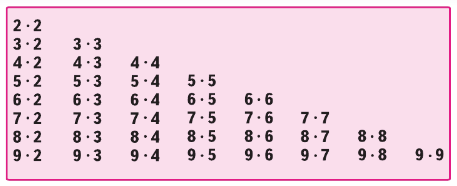 | 2 • 2 = 4 3 • 2 = 6 4 • 2 = 8 5 • 2 = 10 6 • 2 = 12 7 • 2 = 14 8 • 2 = 16 9 • 2 = 18 | 3 • 3 = 9 4 • 3 = 12 5 • 3 = 15 6 • 3 = 18 7 • 3 = 21 8 • 3 = 24 9 • 3 = 27 | 4 • 4 = 16 5 • 4 = 20 6 • 4 = 24 7 • 4 = 28 8 • 4 = 32 9 • 4 = 36 | 5 • 5 = 25 6 • 5 = 30 7 • 5 = 35 8 • 5 = 40 9 • 5 = 45 |