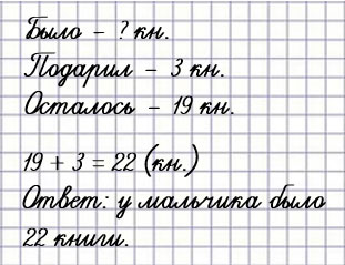18. У мальчика было несколько книг. Когда он подарил товарищу 3 книги, то у него осталось 19 книг. Сколько книг было у мальчика сначала?