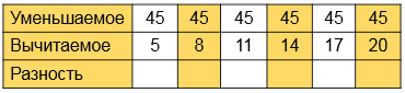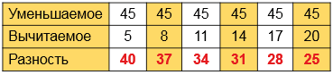 | Уменьшаемое | 45 | 45 | 45 | 45 | 45 | 45 |