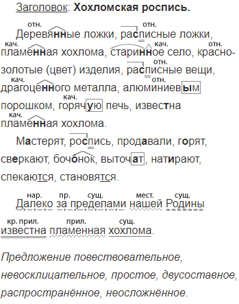 В Нижегородской области м..стерят деревя(н, нн)ые ра(з, с)писные ложки, миски, детскую мебель. Это знаменитая хохломская ро(з, с)пись — пламе(н, нн)ая хохлома. Хохлома — стари(н, нн)ое село, где раньше ирод..вали изделия из дерева. А пламе(н, нн)ой её называют потому, что весёлые (красно)золотые изделия г..рят, как огонь.
