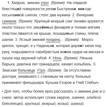 1. Хмурое, зимнее утро. На гладкой блестящ..й поверхности речк.. Быстрянк.., кое(где) посыпа(н, нн)ой3 снегом, стоят два мужика.5 2. Вечерние сумерки. Крупный мокрый снег лениво кружится около только что зажж..(н, нн)ых фонарей и тонким мягким пластом л..жится на крыши, лошади(н, нн)ые спины, плечи, шапки. 3. Ясный зимний полдень... Мороз крепок, трещит, и у Наденьк.., которая держ..т меня под руку, покрываются серебристым ин..ем кудри на висках и пушок над верхней губой. 4. Ночь. Нянька Варька, девочка лет тринадцати, качает колыбель. 5. Земская больница. Утро. За отсутствием доктора, уехавшего с становым на охоту, больных3 принимают фельдшера: Кузьма Егоров и Глеб Глебыч.