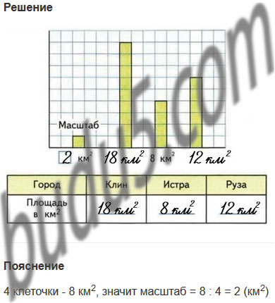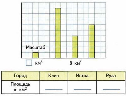 7. На диаграмме показаны площади трёх городов Подмосковья: Истры, Клина и Рузы. Определи масштаб, в котором построена диаграмма, и запиши в таблице площадь каждого города, если площадь Рузы больше, чем площадь Истры, но меньше, чем площадь Клина.