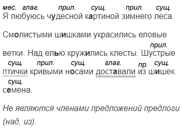 Я любуюсь ч..десной к..ртиной зимнего леса. См..листыми ш..шками украсились еловые ветки. Над ел..ю круж..лись клесты. Шустрые птички кривыми н..сами дост..вали из ш..шек с..мена.
