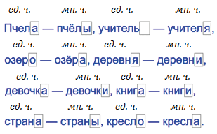 пчела — пчёлы, учитель — учителя, озеро — озёра, деревня — деревни, девочка — девочки, книга — книги, страна — страны, кресло — кресла