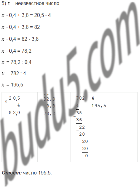 5) Какое число надо умножить на 0,4, чтобы сумма полученного произведения и числа 3,8 была равна произведению чисел 20,5 и 4?
