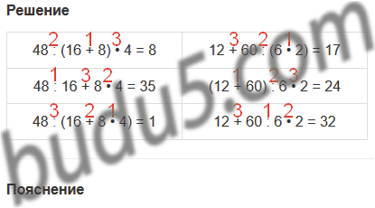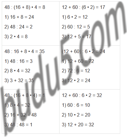 | 48 : 16 + 8 • 4 = 8 | 12 + 60 : 6 • 2 = 17 |