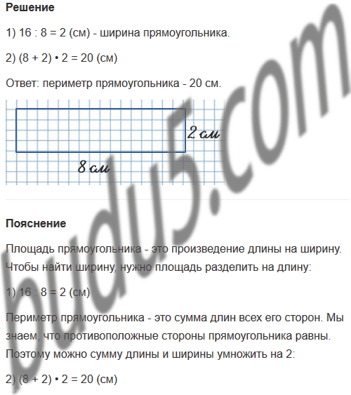 9. Начерти прямоугольник, площадь которого равна 16 см2, а длина одной стороны - 8 см. Найди его периметр.
