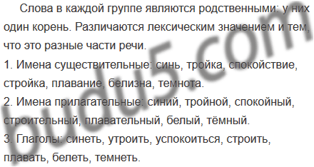 1) Синий, синь, синеть. 2) Тройка, тройной, утроить. 3) Спокойный, спокойствие, успокоиться. 4) Строить, строительный, стройка. 5) Плавать, плавательный, плавание. 6) Белый, белизна, белеть. 7) Тёмный, темнота, темнеть.