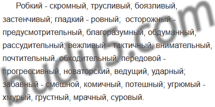 Робкий, гладкий, осторожный, вежливый, передовой, забавный, угрюмый.