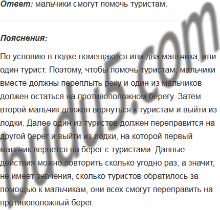 Двое мальчиков находились в лодке у берега реки. К ним обратилась группа туристов с просьбой помочь переправится на противоположный берег. В лодке помещаются или два мальчика, или один турист. Смогут ли мальчики помочь туристам?