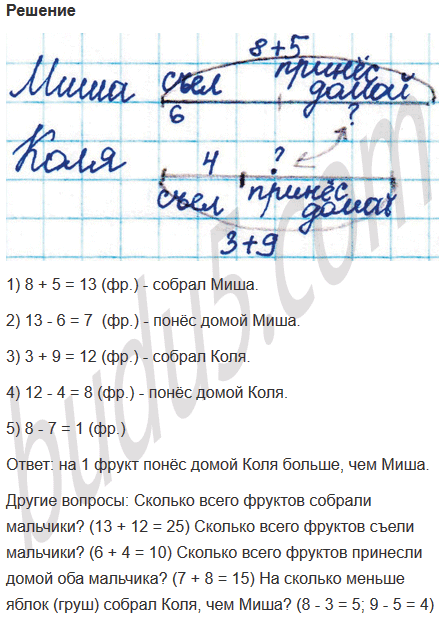 Задание № 9. Миша пригласил Колю в свой сад, где созревали яблоки и груши. Миша сорвал 8 яблок и 5 груш, а Коля - 3 яблока и 9 груш. Миша съел 6 своих фруктов, а Коля - 4 своих. Остальные сорванные ими фрукты каждый мальчик понёс домой. Кто из них принёс домой больше фруктов и на сколько? Что ещё можно узнать?