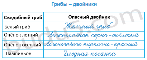 6. С помощью книги "Зелёные страницы" (рассказ "Коварные двойники") впиши в таблицу "Грибы – двойники"  названия опасных грибов – двойников.