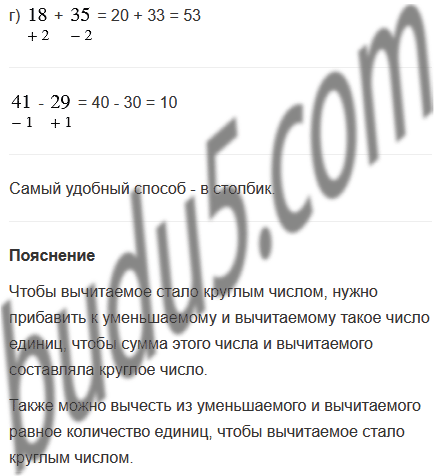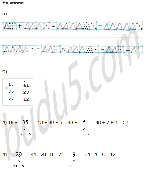 Задание № 1. Реши примеры 18 + 35 и 41 - 29: а) с помощью графических моделей; б) в столбик; в) прибавляя и вычитая по частям; г) дополняя до круглого числа. Какой способ ты считаешь самым удобным?