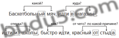 Мяч (какой?); идти (куда?), (откуда?), (как?); красный (от чего? по какой причине?).