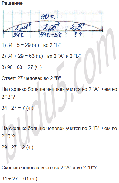 Задание № 5. В трёх вторых классах учится 90 человек. Во 2 "А" учится 34 человека, а во 2 "Б" - на 5 человек меньше, чем во 2 "А". Сколько человек учится во 2 "В"? Какие ещё вопросы можно поставить к этому условию?