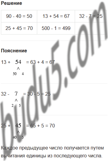 | 90 - 40 | 13 + 54 | 32 - 7 | 25 + 45 | 500 - 1 |