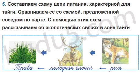 5. Составь схему цепи питания, характерной для тайги. Сравни её со схемой, предложенной соседом по парте. С помощью этих схем расскажи об экологических связях в зоне тайги.