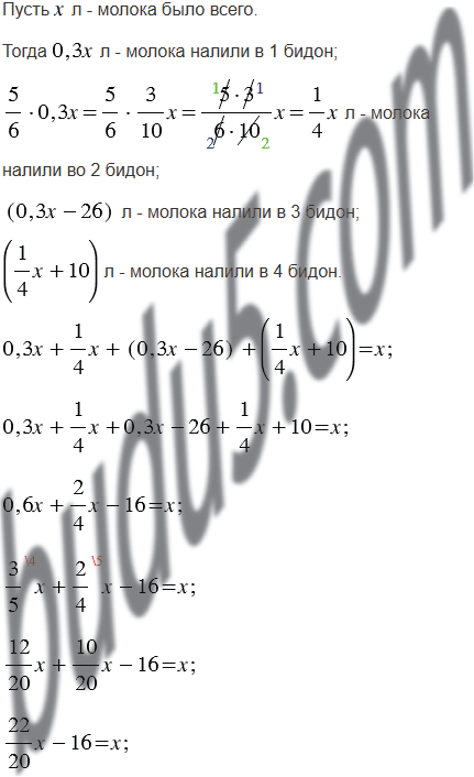 В четыре бидона разлили молоко. В первый бидон налили 30% всего молока, во второй - того, что в первый, а в третий - на 26 л меньше, чем в первый, а в четвёртый - на 10 л больше, чем во второй. Сколько литров молока разлили в четыре бидона?