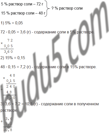 Смешали 72 г пятипроцентного раствора соли и 48 г пятнадцатипроцентного раствора соли. Найдите процентное содержание соли в полученном растворе.