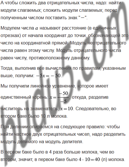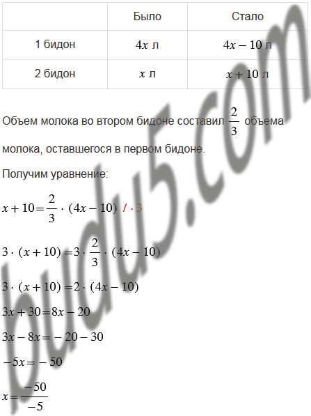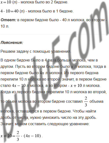 В одном бидоне было в 4 раза больше молока, чем в другом. Когда из первого бидона перелили 10 л молока во второй, то объем молока во втором бидоне составил