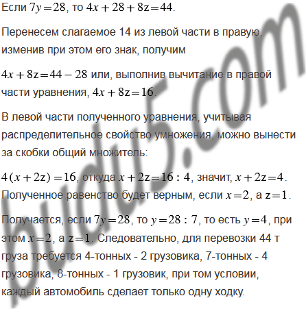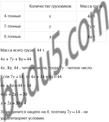 Для перевозки груза выделили 4-, 7- и 8-тонные грузовики. Каждый автомобиль должен сделать только одну ходку. Сколько требуется грузовиков каждого вида для перевозки 44 т груза?