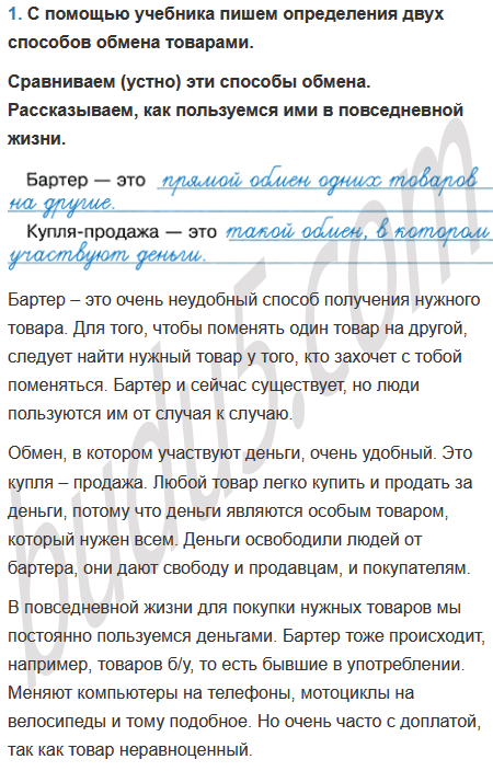1. С помощью учебника напиши определения двух способов обмена товарами.