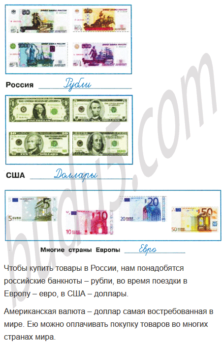 2. Какими деньгами ты воспользуешься, если будешь покупать товары в России? А во время поездки в Европу или США? Вырежи из Приложения фотографии банкнот и помести их в соответствующие окошки. Попроси учителя проверить тебя. После проверки наклей фотографии. Подпиши названия денежных единиц.