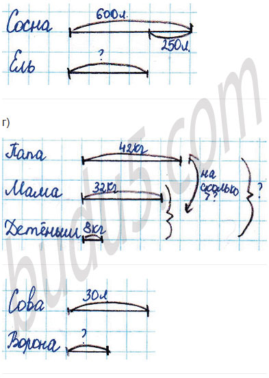 б) Сосна живёт примерно 600 лет. Это на 250 лет больше, чем живёт ель. Сколько лет живёт ель?