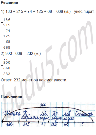Задание № 12. Пират нашёл клад из 900 монет. Чтобы побыстрее его унести, он положил 186 монет в шапку, 215 - в правый карман, 74 - в левый карман, 125 - в правую ладонь, а 68 - в левую. Сколько монет он не смог унести?