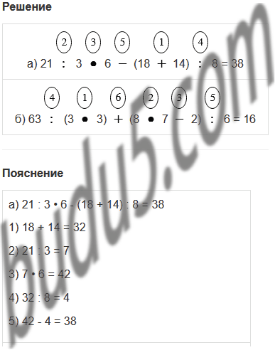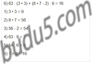 | а) 21 : 3 • 6 - (18 + 14) : 8 | б) 63 : (3 • 3) + (8 • 7 - 2) : 6 |