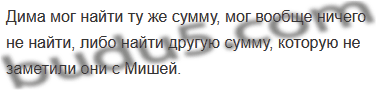 Два мальчика, Дима и Миша, отправились в булочную. По дороге они нашли 20 рублей. Сколько бы денег нашёл один Дима, если бы отправился в булочную?