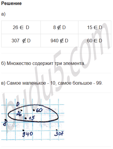 а) Принадлежит ли множеству D числа 26, 307, 8, 940, 15, 60? Отметь их на диаграмме множества D. Сделай записи, используя знаки и .
